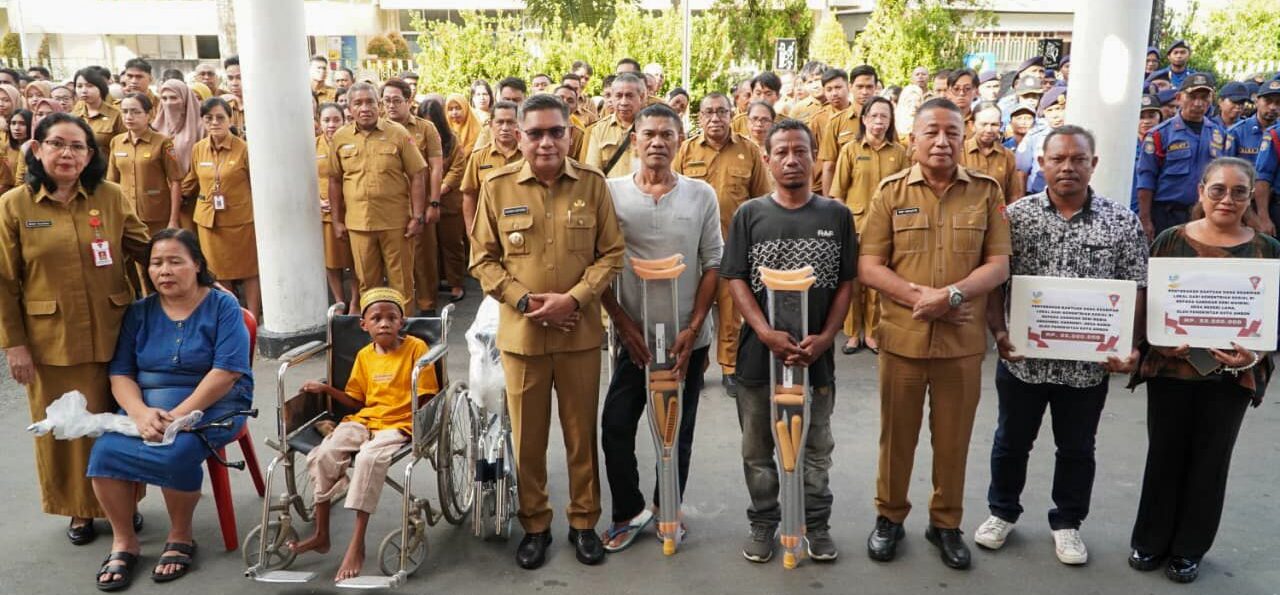 Ambon, CENGKEPALA.COM – Wali Kota Ambon, Bodewin M. Wattimena, menyerahkan bantuan alat bantu bagi penyandang disabilitas berupa kursi roda, tongkat, dan alat bantu lainnya, pada kegiatan apel pagi ASN, Senin (20/10/25) di halaman Balai Kota.